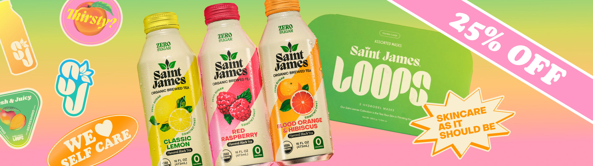 • Saint James organic brewed tea bottle with lemon and flower graphics on a white background